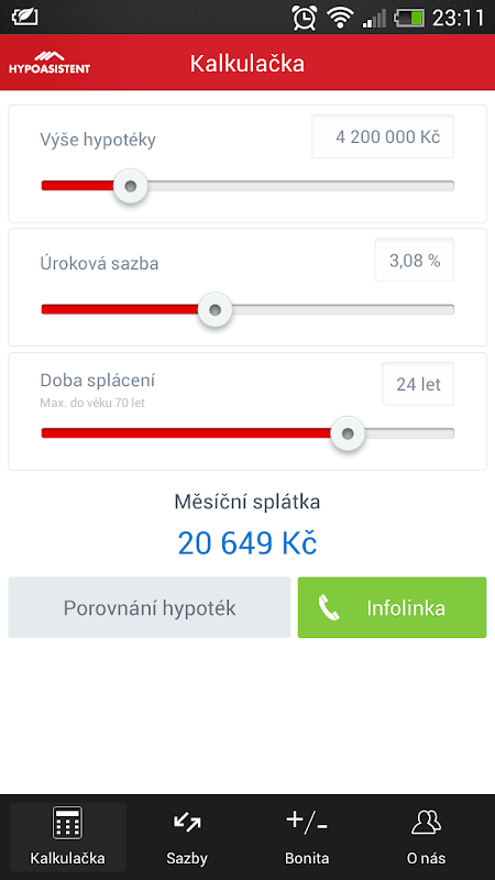 V aplikaci HYPOASISTENT najdete hypoteční kalkulačku, úrokové sazby, porovnání hypoték i ověření Vaší bonity. Všechny výpočty jsou orientační, pro získání přesných výpočtů nás kontaktujte a zdarma připravíme přesnou nabídku. Pokud Vás čeká konec fixace či otázka refinancování hypotéky, jistě oceníte aktuální úrokové sazby pro dané fixace, sledovat můžete také vývoj mezibankovní sazby PRIBOR u Vaší hypotéky s pohyblivou sazbou.