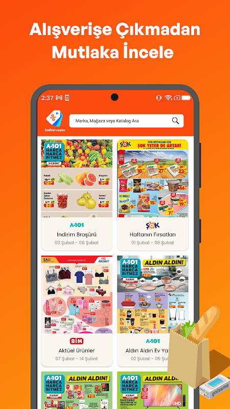 हमारे आवेदन की सामग्री में, जो हमेशा उपभोक्ता के पास होता है, कई चेन सुपरमार्केट जैसे बिम, ए 101, Şok, कैरेफोर्सा, माइग्रोस, मेट्रो, ओनूर, ağdaş, किम, बिज़िम, हैप्पी सेंटर, हकमार, Çağrı हाइपरमार्केट, एसेन मॉल, zpaş सुपरमार्केट, Ikea, Koçtaş, Tekzen, Bauhaus, Watsons, Rossmann, Gratis, Farmasi, Oriflame, Arden, Seç, Özkuruşlar, Mopaş, Oruç Market और कई अन्य ब्रांडों के डिस्काउंट कैटलॉग प्रकाशित किए गए हैं।
