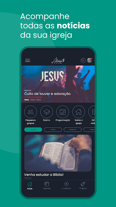 आवेदन में उपलब्ध संसाधन: समाचार, चर्च एजेंडा, घटनाएँ, सामग्री, परियोजनाएँ, लाइव प्रसारण और शिक्षण मॉड्यूल।
