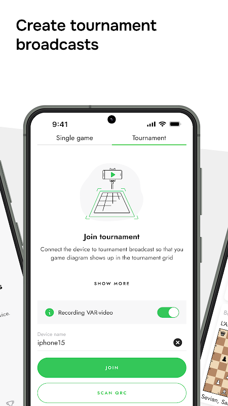 IdChess के लिए धन्यवाद, हर कोई आपके गेम को नियमित बोर्ड पर देख सकता है। पूरे टूर्नामेंट को प्रसारित करने के लिए एकल प्रसारण करें या idChess का उपयोग करें!