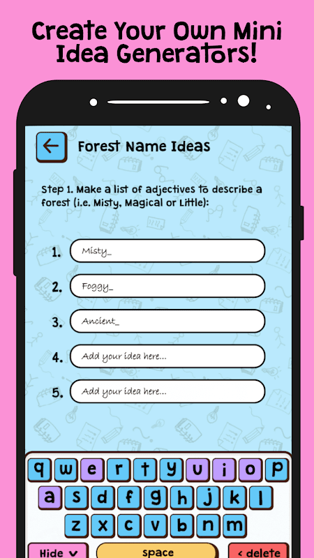 + नया: बिल्कुल नए 'अपना खुद का बनाएं' बटन के साथ टेम्पलेट्स का उपयोग करके अपना खुद का मिनी आइडिया जेनरेटर बनाएं।