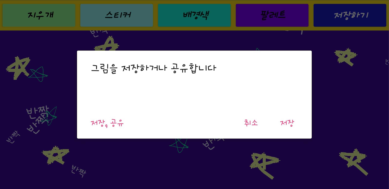 Idea Sketch में कुल 5 बटन होते हैं। इरेज़र बटन बैकग्राउंड और ग्रैफिटी को अलग-अलग मिटा सकता है। स्टिकर बटन आपको जितना चाहें विभिन्न आकृतियों के स्टिकर डालने की अनुमति देता है, और यदि आप टेक्स्ट इनपुट आइटम का चयन करते हैं, तो आप वांछित टेक्स्ट भी सम्मिलित कर सकते हैं। पृष्ठभूमि रंग बटन और पैलेट बटन आपको स्पेक्ट्रम का उपयोग करके आसानी से और आसानी से वांछित रंग का चयन करने की अनुमति देते हैं। सहेजें बटन आपको कैमरे का उपयोग करके एक तस्वीर लेने के लिए अपने स्मार्टफोन को सहेजने और साझा करने और हिलाने की अनुमति देता है।