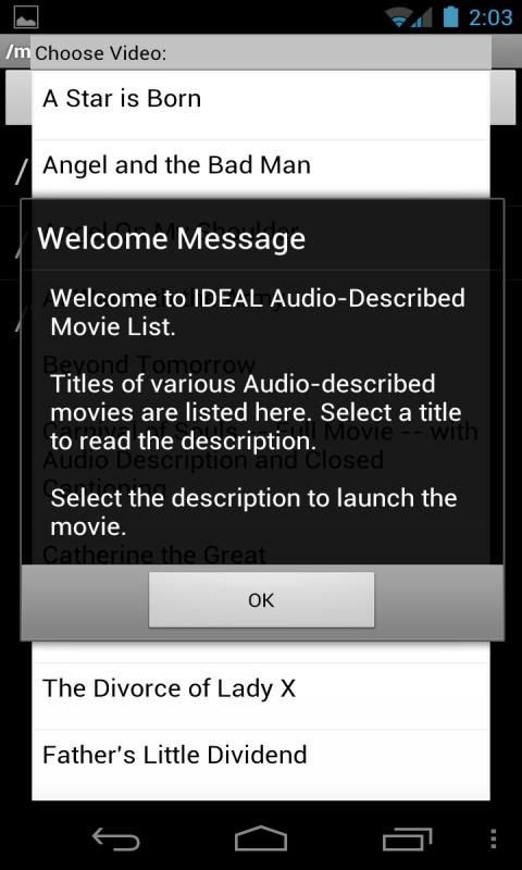 IDEAL Audio Described (AD) Movie Viewer is just what the name implies. It is an easy-to-use, fully-accessible, audio-described movie viewer.