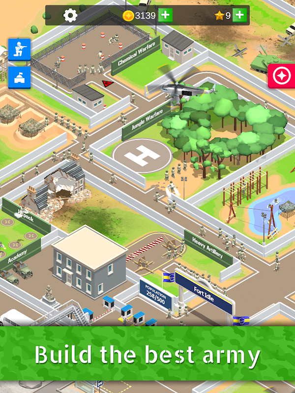 यह युद्ध है! यह सुपरमार्केट, खदान, पुलिस स्टेशन, टीवी स्टेशन या रोलरकोस्टर राइड जैसी कोई पारंपरिक चीज़ नहीं है! यह एक निष्क्रिय आर्मी बेस है और एक मैनेजर के रूप में, आप एक पूंजीवादी करोड़पति टाइकून की तरह अमीर बनने जा रहे हैं - धन, नकदी और सोने से भरा हुआ।