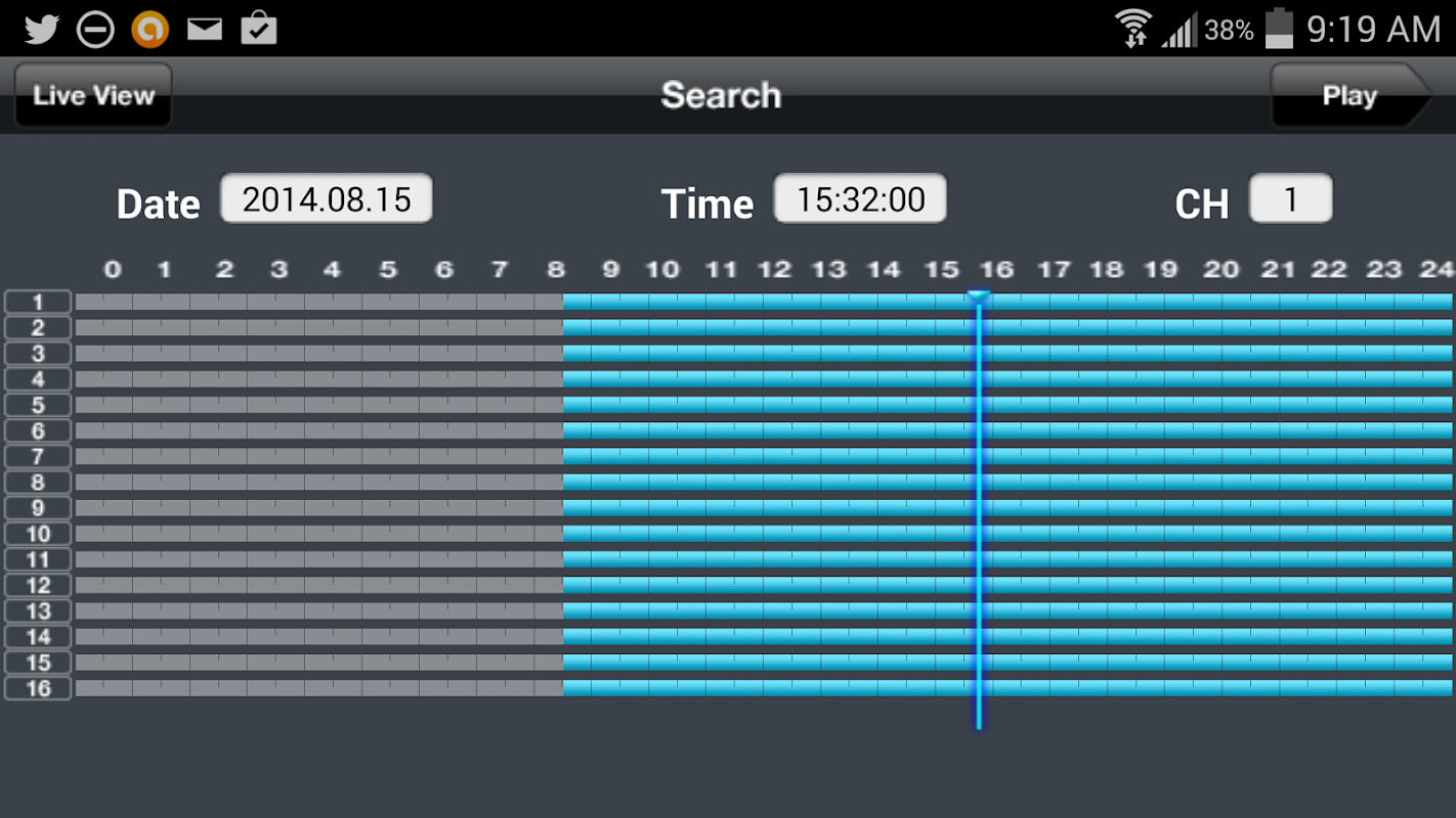 This mobile app for Android also lets users search and playback recorded surveillance video footage from the DVR's hard drive. User can access video footage on the local network where the DVR is located or remotely over the Internet. There are two ways that users can search and play back recorded video. The first option is to access the search menu where users can select a date and time to being video playback. The second method is to search the DVR's log for events such as camera motion detection or external alarms (such as PIR motion sensors and magnetic door / window sensors) being triggered.