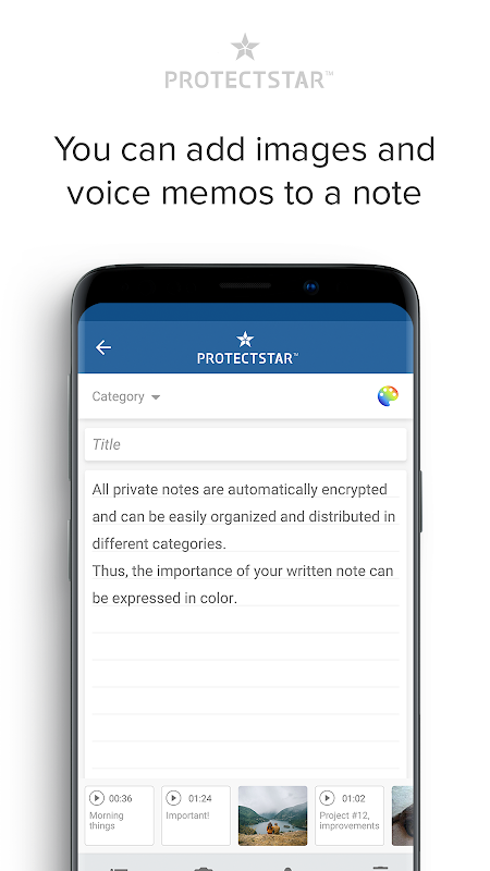 सभी व्यक्तिगत नोट स्वचालित रूप से एन्क्रिप्ट किए जाते हैं, उन्हें व्यवस्थित किया जा सकता है, और व्यक्तिगत श्रेणियों को सौंपा जा सकता है। इस तरह, एक लिखित नोट के महत्व को भी जल्दी से रंग में पकड़ा जा सकता है।