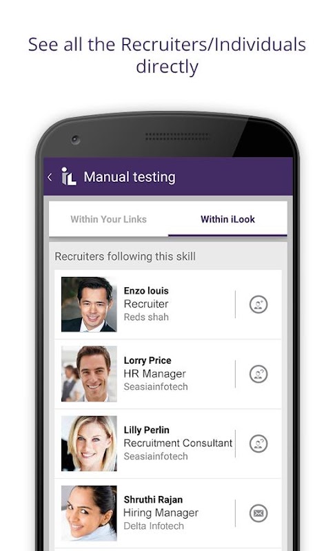 • Search jobs/ Skilled People in an unique way using your areas of expertise/Skillset. Just keep adding all your skillsets in your iLook profile and you will start getting displayed directly with all of the recruiters/individuals respectively.