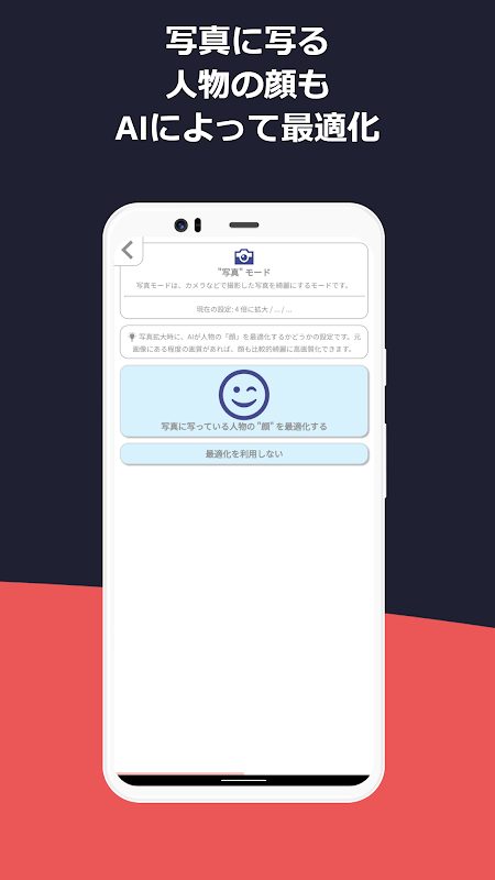 इसमें "किसी व्यक्ति के चेहरे" की भविष्यवाणी करने का एक कार्य भी है, जो सामान्य एआई के साथ अच्छा नहीं है, इसलिए यदि फोटो में एक निश्चित स्तर की छवि गुणवत्ता है, तो आप "किसी व्यक्ति की तस्वीर" को अपेक्षाकृत सुंदर बना सकते हैं। .. (जब आप फोटो मोड और "चेहरा अनुकूलन" का चयन करते हैं तो सक्षम करता है)