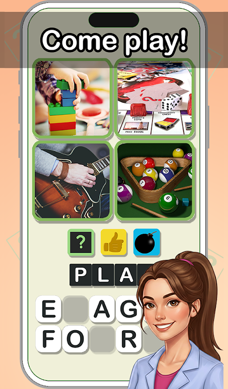 हर लेवल में, आपको 4 तस्वीरें दिखाई जाएँगी. आपको इन तस्वीरों से जुड़े शब्द का अनुमान लगाना होगा. कीबोर्ड पर अक्षर और उत्तर स्थान में अक्षरों की संख्या आपको पहेली का हल ढूँढ़ने में मदद करेगी.