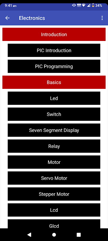 इस ऐप में शामिल हैं: माइक्रोकंट्रोलर- 8051 माइक्रोकंट्रोलर, Arduino, ARM7 माइक्रोकंट्रोलर, AVR माइक्रोकंट्रोलर, PIC माइक्रोकंट्रोलर, इलेक्ट्रॉनिक्स प्रतीक और आर्किटेक्चर, पिन आरेख और रजिस्टरों के साथ विभिन्न माइक्रोकंट्रोलर को प्रोग्राम करने के तरीके पर विस्तृत विवरण, और यह इंटरफ़ेस घटकों जैसे सर्किट आरेख और प्रोग्राम प्रदान करता है। एलईडी, स्विच, सात खंड डिस्प्ले, रिले, मोटर, सर्वो मोटर, स्टेपर मोटर, एलसीडी, जीएलसीडी, कीपैड और पेरिफेरल जैसे एनालॉग से डिजिटल कनवर्टर, इंटरप्ट, पीडब्लूएम, यूआर्ट, टाइमर, आई2सी और संचार उपकरण जैसे जीएसएम, जीपीएस, एचसी- 05 ब्लूटूथ, आरएफआईडी, ज़िग्बी, आरएफ, ईथरनेट और सेंसर जैसे अल्ट्रासोनिक, आग, गैस, आर्द्रता, आईआर दूरी, एलडीआर, लोडसेल, एक्सेलेरोमीटर, पीर, आरटीसी, मिट्टी, टीएसओपी, एसडी कार्ड।