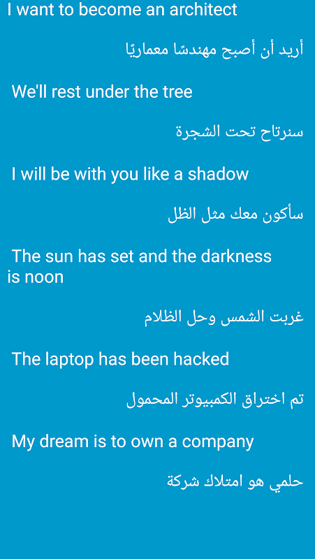 يحتوي التطبيق على أمثال وجمل السؤال وجمل التعابير و الشعور وجمل تحفيزيه ومشهوره في اللغة الإنجليزية ومستعمله بكثره بينهم والكثير