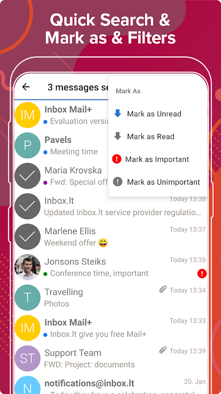 • स्वाइप क्रियाएं - ईमेल को तुरंत हटाएं या स्वाइप क्रियाओं से अपठित के रूप में चिह्नित करें।