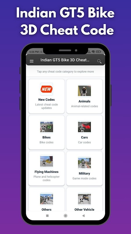 इंडियन GT5 बाइक 3D कोड गाइड एक चीट कोड संदर्भ ऐप है जो GTA-शैली के ओपन-वर्ल्ड गेमप्ले के लिए इन-गेम कोड ब्राउज़ करना और सीखना आसान बनाता है.