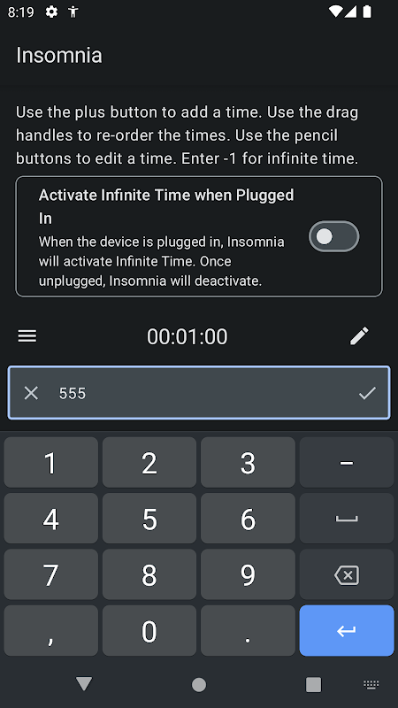 अनिद्रा एक ही सिद्धांत पर काम करती है। त्वरित सेटिंग्स टाइल के उपयोग के माध्यम से, आप पूर्वनिर्धारित स्क्रीन टाइमआउट ओवरराइड्स: 1, 5, 10, 30 और अनंत मिनटों के माध्यम से साइकिल चलाने के लिए अनिद्रा का उपयोग कर सकते हैं। हालाँकि, यदि आप अपना खुद का टाइमआउट सेट करना चाहते हैं (1 या 2 घंटे कहते हैं), या आप कुछ पूर्वनिर्धारित टाइमआउट निकालना चाहते हैं, तो आप ऐसा कर सकते हैं!