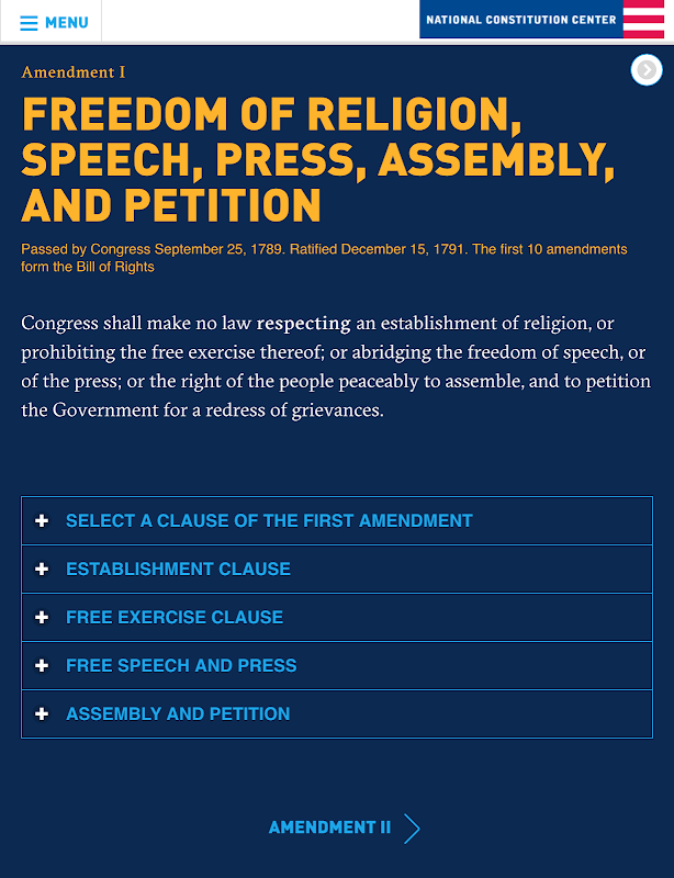 The free Interactive Constitution app presents the full text of the U.S. Constitution and features essays by leading scholars that detail areas of agreement and disagreement across a range of philosophical and legal perspectives. Created by the National Constitution Center in partnership with the American Constitution Society and the Federalist Society, this nonpartisan resource is featured by the College Board in its Advanced Placement history and government courses. The Interactive Constitution was made possible by a grant from the John Templeton Foundation.