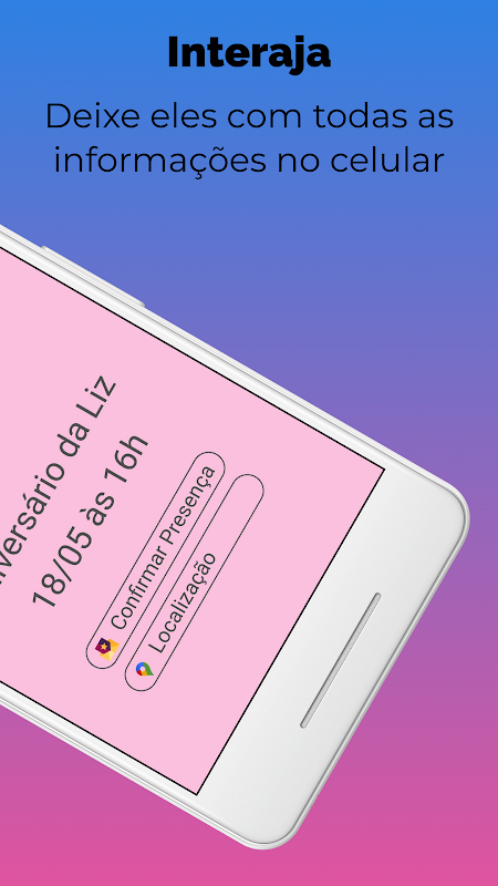 इंटरएक्टिव निमंत्रण के साथ आप पहले से ही घटना के स्थान के साथ निमंत्रण भेजते हैं, आपका अतिथि एक बटन क्लिक करता है और यही है, आपके इवेंट का मार्ग आपके सेल फोन पर पहले से ही है।