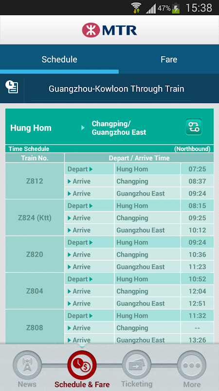 MTR चीन और हांगकांग (चांगपिंग, गुआंगझोउ, बीजिंग और शंघाई) के बीच अंतर यात्री सेवा प्रदान करता है। यात्रियों द्वारा त्वरित खोज के लिए इस एप्लिकेशन के माध्यम से समय सारिणी, किराया, टिकटिंग जानकारी और नवीनतम समाचार उपलब्ध हैं।