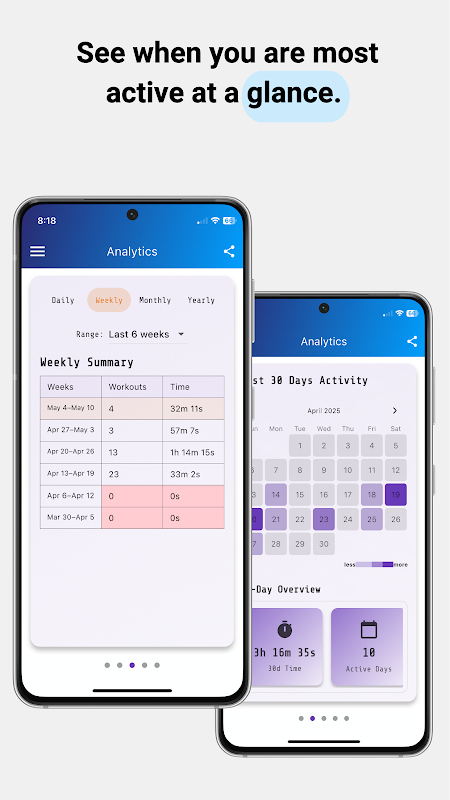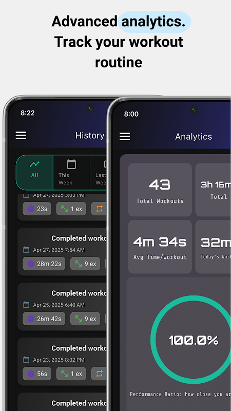 हर कसरत स्वचालित रूप से सहेजी जाती है - कोई कैप नहीं। पिछले सत्रों को स्क्रॉल करें और सप्ताहों और महीनों में प्रगति को ट्रैक करें।