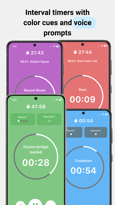 असीमित राउंड, कार्य/आराम ब्लॉक, वार्म-अप, कूलडाउन बनाएँ—सेकंड तक। प्रत्येक कसरत को अपनी सटीक दिनचर्या के अनुसार बनाएँ।