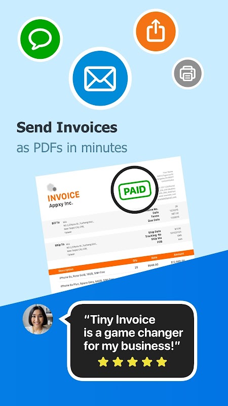 * सभी माध्यमों से अपने दोस्तों और ग्राहकों के साथ चालान और अनुमान साझा करें, जैसे चित्र, पीडीएफ, ईमेल, iMessage, आदि।