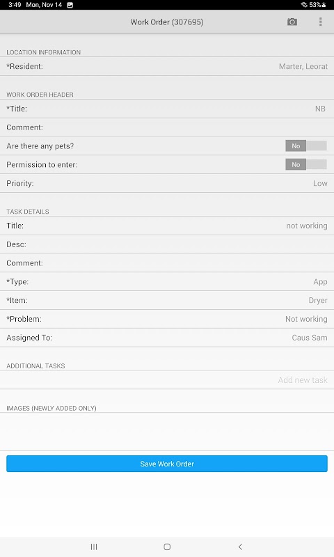 b.निरीक्षण: निवासियों के बाहर जाने के साथ मूव आउट वॉकथ्रू करते समय प्रॉपर्टी मैनेजर या लीजिंग एजेंट जैसे अंतिम उपयोगकर्ता को वर्क ऑर्डर सबमिट करने की अनुमति देता है। मुख्य रूप से छात्र आवास किरायेदारों के लिए अभिप्रेत है।