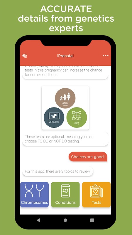 iPrenatal गुणसूत्रों की व्याख्या करता है, ऐसी स्थितियां जो प्रसव पूर्व जांच की पहचान कर सकती हैं, और एनआईपीटी (गैर-प्रसूतिपूर्व प्रसवपूर्व परीक्षण) सहित उपलब्ध विकल्पों का परीक्षण कर सकती हैं और इसे रोश के डॉक्टरों और आनुवंशिक विशेषज्ञों की एक टीम द्वारा विकसित किया गया था।