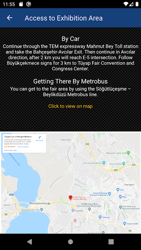 - नेविगेशन फ़ंक्शन आपको प्रदर्शनी क्षेत्र और वांछित प्रदर्शक और उचित क्षेत्र के भीतर बूथ को आसानी से खोजने की अनुमति देता है।