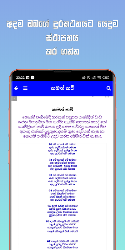 इस एप्लिकेशन में आप सभी सिंहल जन कवी, प्रस्थ पिरुलु (सिंहली नीतिवचन), सिंहल थेरविली, कमथ बसा, दीवारा बसा और वादी जन आवारा सीख सकते हैं।