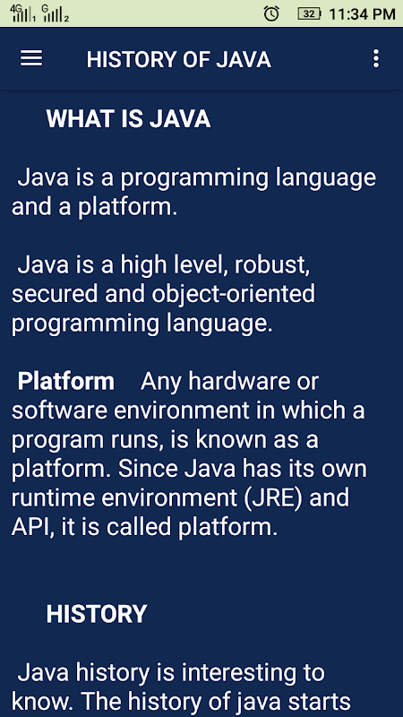 Java Tutorial is basically developed for it students here they can learn java from beginning. In this app users can learn java very easily. It’s fast and, despite its playful appearance, it’s serious stuff: a complete introduction to object-oriented programming and java. You’ll learn everything from the fundamentals to advanced topics, including threads, and distributed programming .So learning in this way is more important than ever.