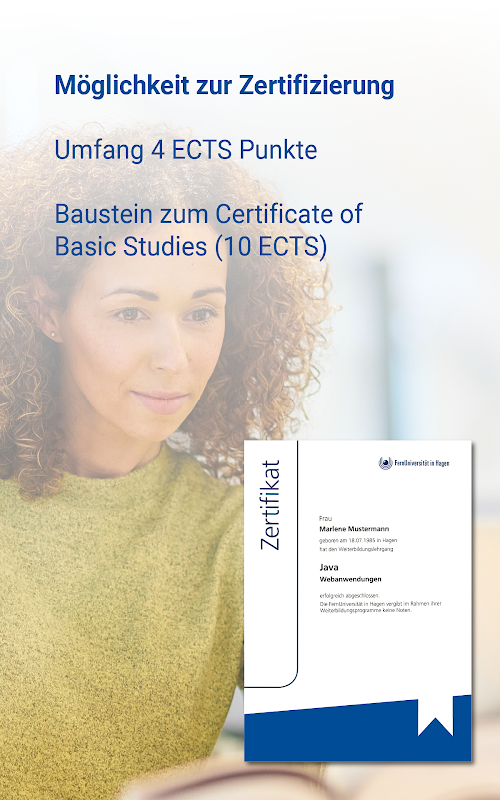 जावा प्रोग्रामिंग भाषा का उपयोग मानक एप्लिकेशन और एप्लेट के अलावा, वेब एप्लिकेशन बनाने के लिए भी किया जा सकता है। जावा केवल अनुरोध पर ही गतिशील रूप से वेबसाइट बनाने और उपयोगकर्ताओं को उनकी विशिष्ट आवश्यकताओं के अनुरूप वर्तमान जानकारी प्रदान करने की संभावना प्रदान करता है। विशिष्ट एप्लिकेशन में ऑनलाइन बैंकिंग, ऑनलाइन शॉपिंग, नीलामी आयोजित करना और जानकारी प्रदर्शित करना (शेयर मूल्य, मौसम पूर्वानुमान, आदि) शामिल हैं। यह कोर्स विशेष जावा-आधारित तकनीकों (सर्वलेट, JSP (जावासर्वर पेज), JSF (जावासर्वर फेस) और स्ट्रट्स) का उपयोग करके ऐसे एप्लिकेशन को कैसे कार्यान्वित किया जाता है, इस पर प्रकाश डालता है।