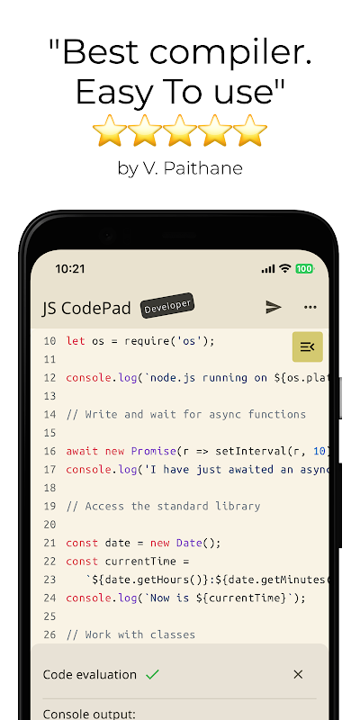 आप इस ऐप से जेएस कोड और प्रोग्राम चला सकते हैं, निष्पादित कर सकते हैं और मूल्यांकन कर सकते हैं।