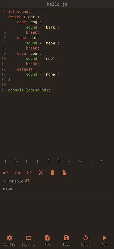 मिनिमलिस्ट जावास्क्रिप्ट कोड संपादक जो आपको अपने मोबाइल डिवाइस से चलते-फिरते कंसोल स्क्रिप्ट चलाने की अनुमति देता है।