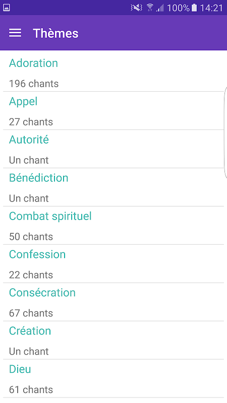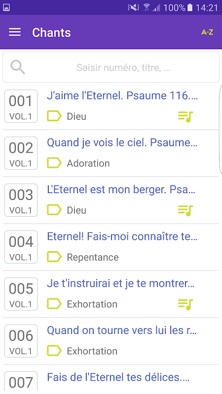 • Lister les chants par thème, par volume, par numéro ou par ordre alphabétique