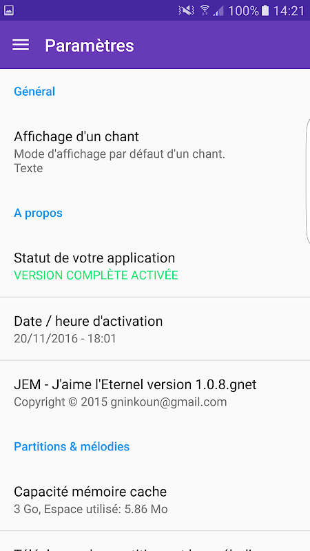 • L’application est gratuite en version démo pour un mois d’utilisation. Pour continuer à accéder à tous les chants ainsi qu’à toutes les fonctionnalités, il vous faudra acheter un produit intégré (Paramètres), géré par les éditions JEM.
