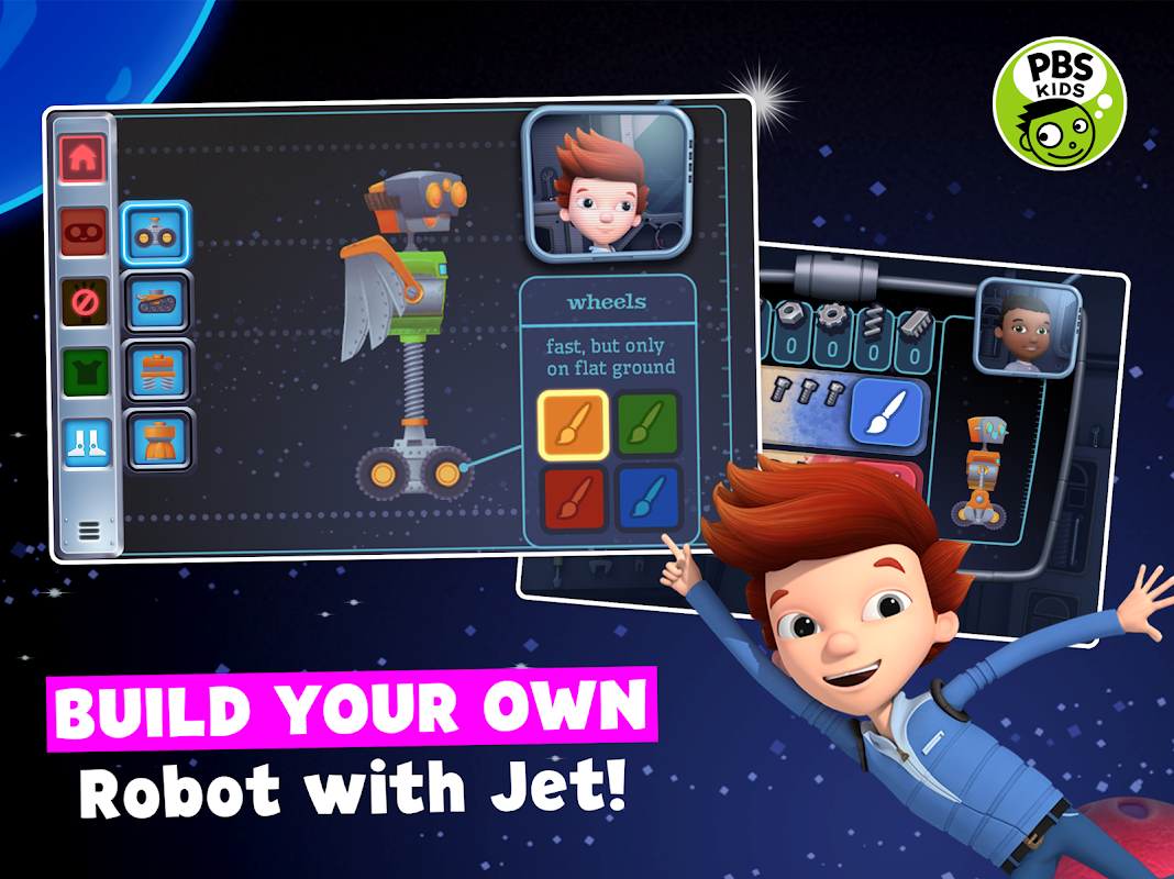 जेट और उसके दोस्तों के साथ बच्चे अपना रोबोट बना सकते हैं! "रेडी, जेट, गो!" के साथ सौर प्रणाली का अन्वेषण करें और विज्ञान, इंजीनियरिंग और समस्या सुलझाने के कौशल सिखाने वाले सीखने वाले खेलों का आनंद लें।