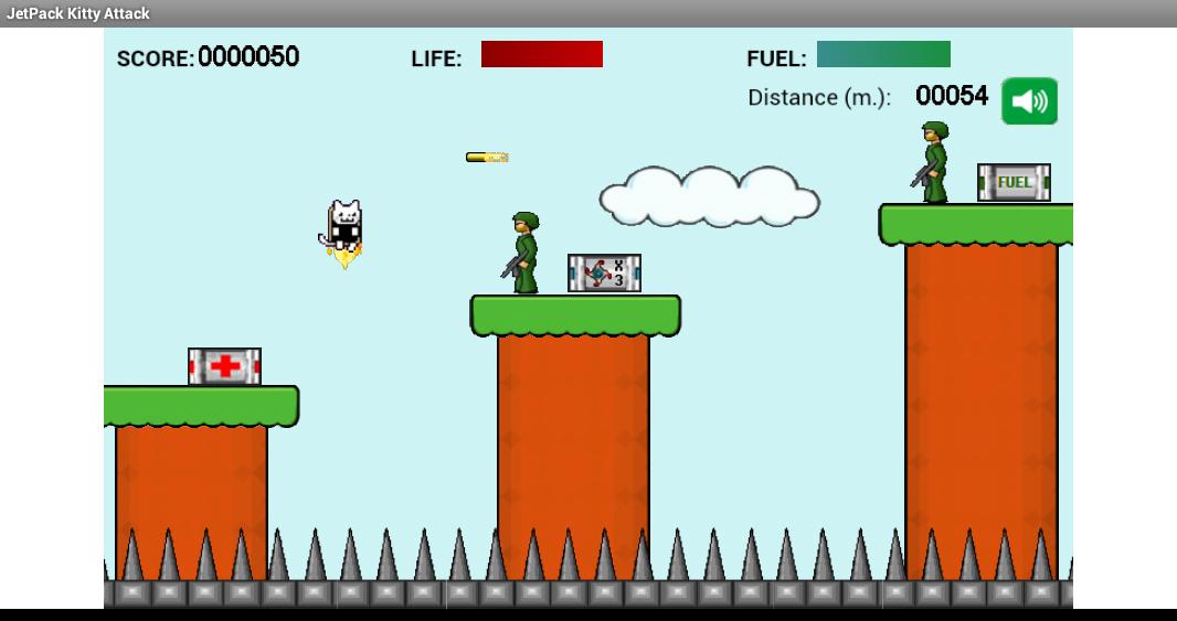 Oh noes! Snowball, the genetically engineered, jet-pack-piloting super-kitty is trying to escape from the military. Help him get as far as you can. Only the tops of the green platforms are safe. Watch out for the sides of pillars, the giant spikes, fire from enemy soldiers, incoming missiles and spinning blades. Take out enemy soldiers by landing on top of them.