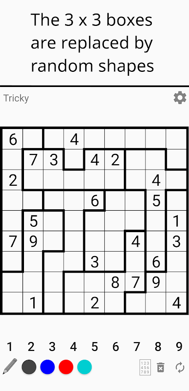 इस एप्लिकेशन में, आप आरा सुडोकु पर अपने सुडोकू सुलझाने के कौशल का परीक्षण कर सकते हैं, जहां मानक 3 x 3 ब्लॉकों को 9 कोशिकाओं के यादृच्छिक आकार द्वारा प्रतिस्थापित किया जाता है।