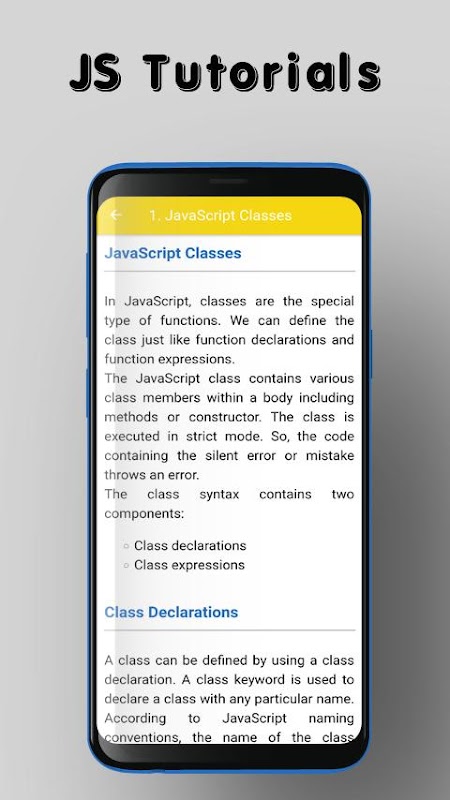 "JS Tutorial - Learn JavaScript" is a best application in play store to learn easily javascript for js developer. "JS Tutorial - Learn JavaScript" provides basic and advanced concepts of JavaScript. Our "JS Tutorial - Learn JavaScript" is designed for beginners and professionals.