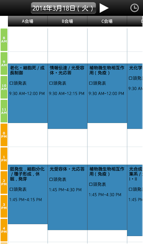 1日分のセッションを確認できるタイムテーブル機能です。現在開催中のセッションを確認するほか、各セッションの詳細画面に進むこともできます。