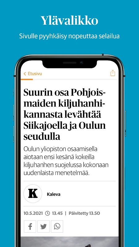 कालेवा एप्लिकेशन में, आपको इजोकिसेडु, पायजोकिसेडु, रैंटालक्यूज़, सिकाजोकिलाक्सो और फोरम24 से दृश्य पत्रिकाएं भी मिलेंगी।