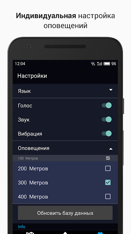 एप्लिकेशन आपको आवाज संकेत, बीपर, कंपन और स्ट्रैबॉस्कोप मोड के साथ कैमरे के बारे में पहले से चेतावनी देता है। आप सेटिंग्स में अलर्ट का प्रकार और आवश्यक दूरी चुनें।