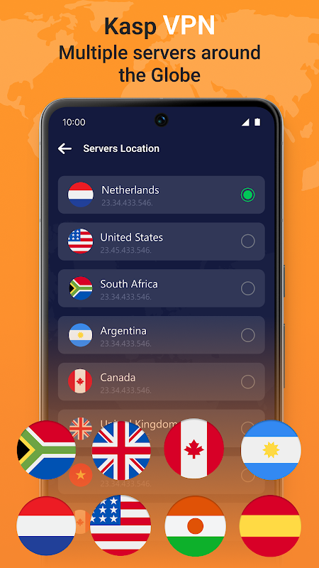 Kasp VPN के साथ, आपके पास प्रॉक्सी सर्वर के वैश्विक नेटवर्क तक असीमित पहुँच है। हमारे असीमित बैंडविड्थ प्रॉक्सी सर्वर एक तेज़, सुरक्षित और निजी इंटरनेट अनुभव प्रदान करते हैं। चाहे आप वीडियो स्ट्रीम कर रहे हों, ऑनलाइन गेमिंग कर रहे हों या बस ब्राउज़िंग कर रहे हों, Kasp VPN सुनिश्चित करता है कि आपका कनेक्शन हमेशा सुरक्षित रहे और आपका डेटा असीमित ब्राउज़िंग के लिए निजी रहे।