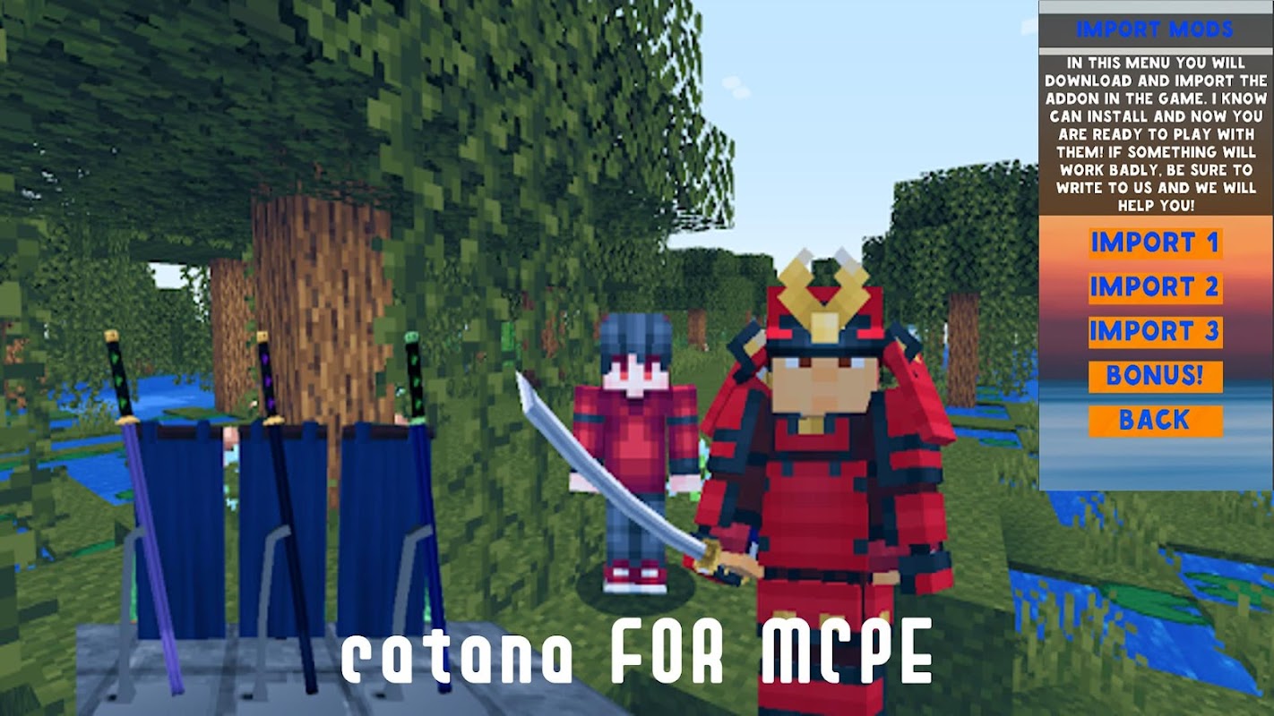यहां आप एमसीपीई के लिए लोकप्रिय एनीम कटाना एडॉन्स डाउनलोड कर सकते हैं। Minecraft के लिए Addons आपके गेम को और अधिक रोचक बना देगा, इसमें नए आइटम, जानवर और राक्षस दिखाई देंगे। हमारे पास भीड़ और राक्षसों के लिए ऐडऑन हैं, दुश्मनों को हराने के लिए एक हथियार मोड, दुनिया भर में यात्रा करने के लिए कारों और विमानों के लिए एक ऐडऑन, तंत्र के प्रेमियों के लिए एक तकनीकी ऐडऑन, अज्ञात और कई अन्य कूल ऐडऑन से प्यार करने वालों के लिए जादू के लिए एक ऐडऑन है। . एमसीपीई के लिए सबसे अच्छा मोड।