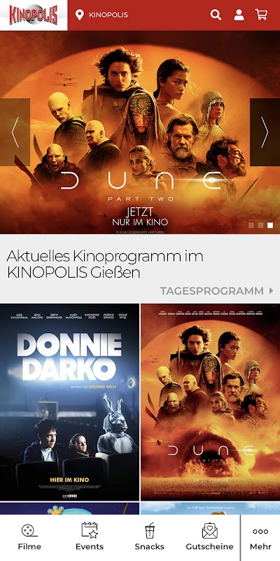 - वांछित प्रारूप में वर्तमान सिनेमा कार्यक्रम, उदाहरण के लिए सूची या पोस्टर दृश्य में फिल्में, चाहे दैनिक या साप्ताहिक अवलोकन