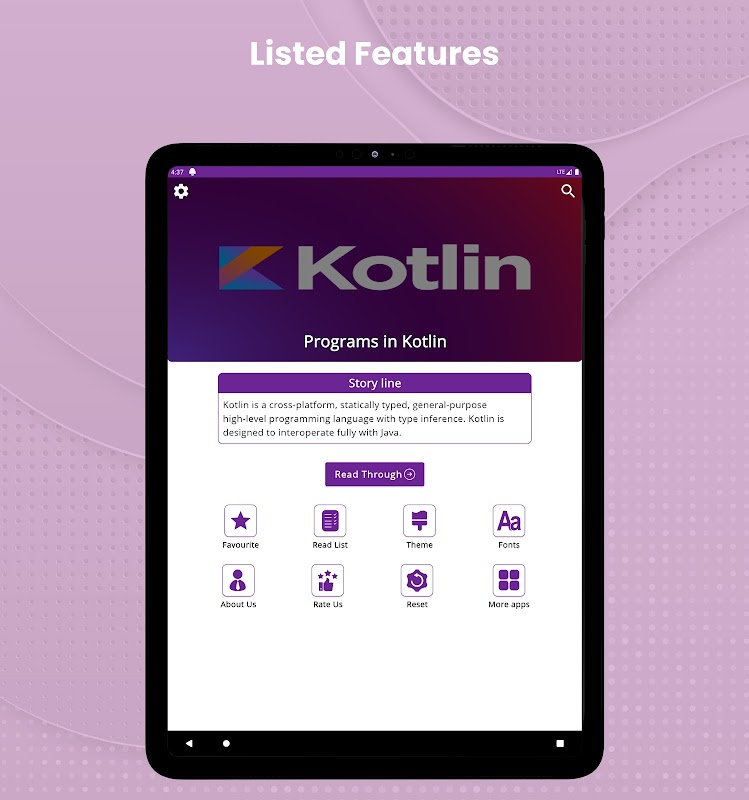 ● कोटलिन प्रोग्रामिंग का इंटरफ़ेस बहुत उपयोगकर्ता के अनुकूल है। आपको बस ऐप खोलना है और कोई भी विषय चुनना है जिसके बारे में आप जानना चाहते हैं, और सभी उत्तर प्रदर्शित होंगे।