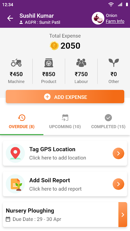 - फसल चक्र में अपने खर्च को ट्रैक करने के लिए प्रत्येक कार्य में किए गए रिकॉर्ड व्यय