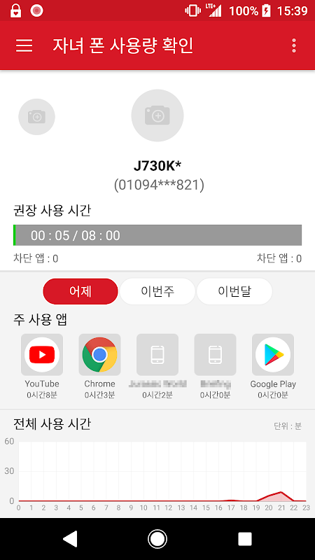 2. 자녀폰에서 게임, 메신저 등의 앱의 사용시간 조절 및 개별차단 가능!