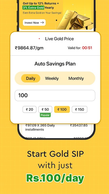 📌 दैनिक/मासिक SIP – अपनी बचत को ₹100 प्रतिदिन या ₹1000/माह से डिजिटल गोल्ड में स्वचालित करें।