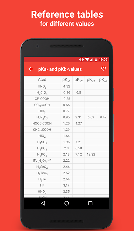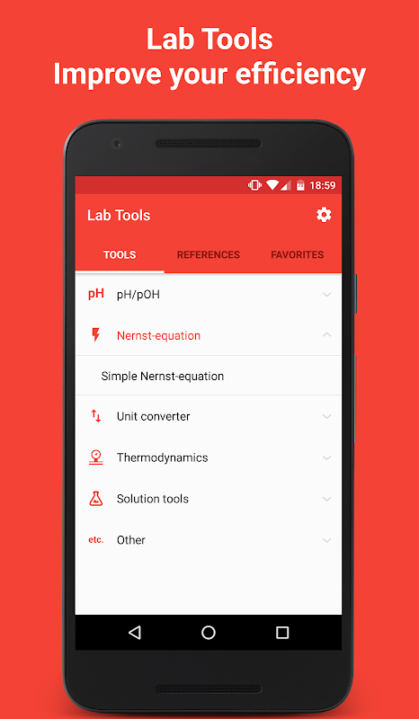 The tools cover different topics from solution properties like pH-value to physicochemical calculations like the Boyle-Mariotte-Law. Additionally the app features an unit converter for different values like length, volume, weight etc.