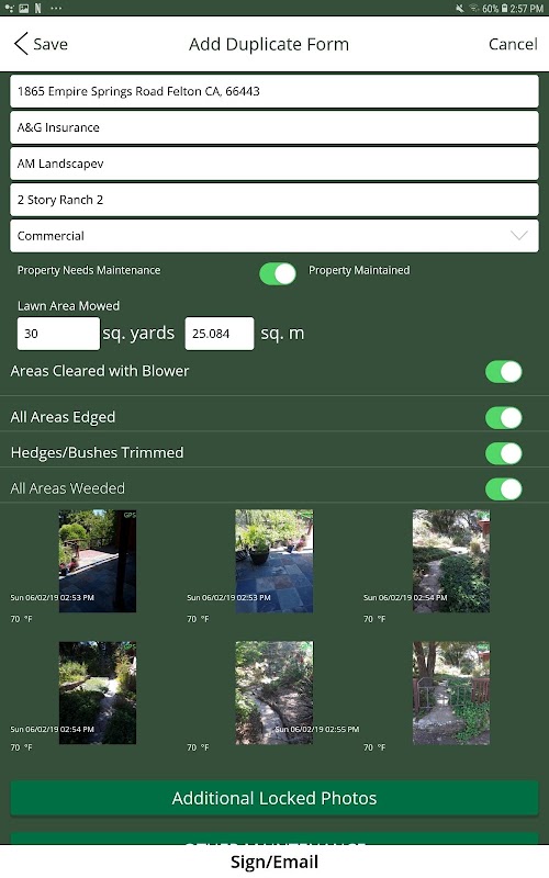 Areas properly maintained may be selected and auto-filled into the document. This document satisfies most insurance, property, and homeowner documentation. Images of planted areas, flower bed, lawns and fields, trees can be captured and time-date stamped into the certification document.
